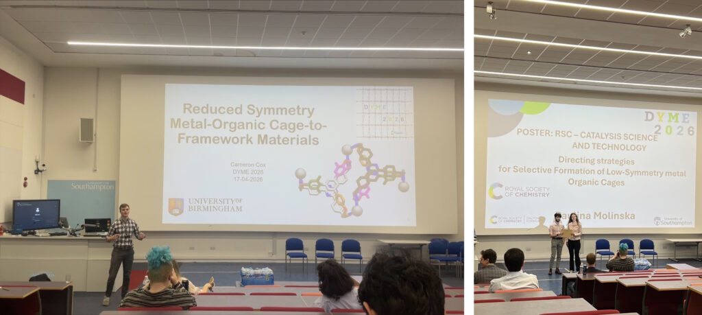 2 July 2025 – Cam and Paulina attend the MASC ECR meeting in Oxford where Paulina gave a talk about her work on low-symmetry metal-organic cages and Cam presented a poster on his work with organic cages that we will hopefully be able to share with you soon!